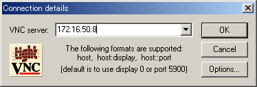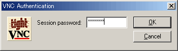 「スタート」メニューから、「TihgtVNC」→「TightVNC Viewer(Fast compression)」を起動してください。以下のような画面が現れたら、VNC