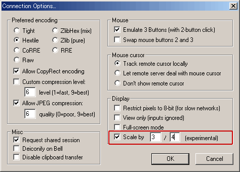 by 3/4 などとして縮小表示しておきます。逆に、サーバー側の画面解像度の方が低い場合は等倍でも構わないでしょう。設定を終えたら「OK」をクリックし、再度、上図の画面に戻ったら「OK」をもう1度クリックしてVNCサーバーに接続してみてください。