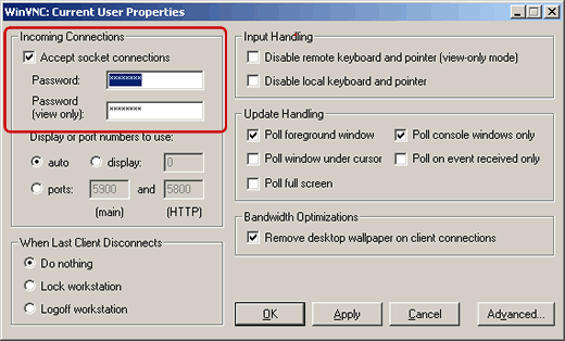 User Setting」で変更する事ができます。最低限、必要な設定は、赤枠で囲んだVNC Server へのログインパスワードです。ここで入力するパスワードを第三者に知られてしまうと、誰でもパソコンを操作する事が可能になってしまうので、安易なパスワードは避けるようにしましょう。他の部分は、とりあえずデフォルトで問題ありません。
