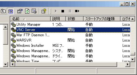 VNC Server 側で「マイコンピュータ」を右クリックして、「管理」→「サービスとアプリケーション」→「サービス」で