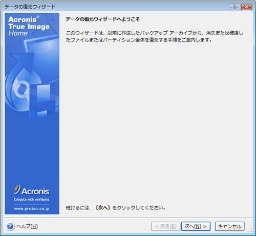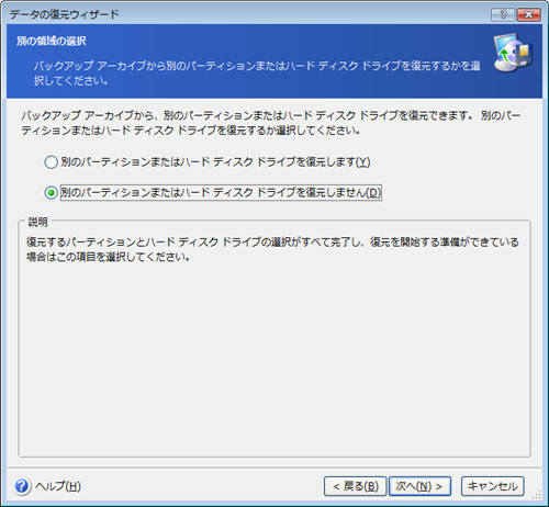 バックアップアーカイブから別のパーティションやハードディスクを復元するかどうかを選びます。ここでは「別のパーティションまたはハードディスクドライブを復元しません」にチェックを入れて先に進みます。