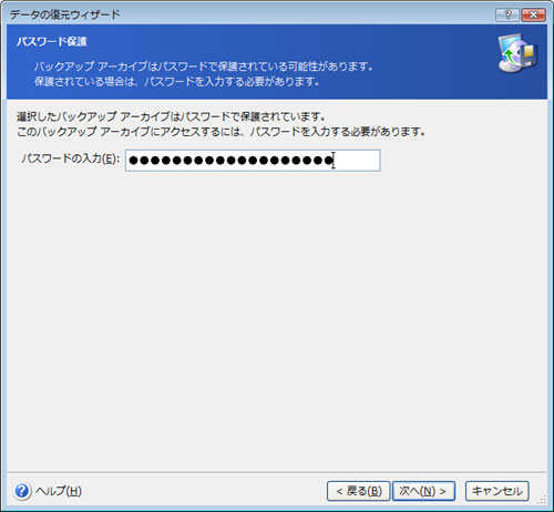 バックアップ時に設定したパスワードをここで入力します。もし、バックアップ時のパスワードを忘れてしまったなら復元することができません。もう一度、バックアップを作り直してください。