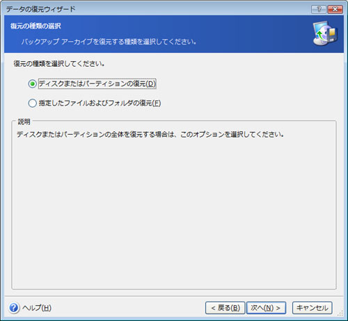 「ディスクまたはパーティションの復元」を選択して「次へ」をクリックします。指定したファイルやフォルダのみを復元することもできるので、その場合は「指定したファイルおよびフォルダの復元」を選択しましょう。