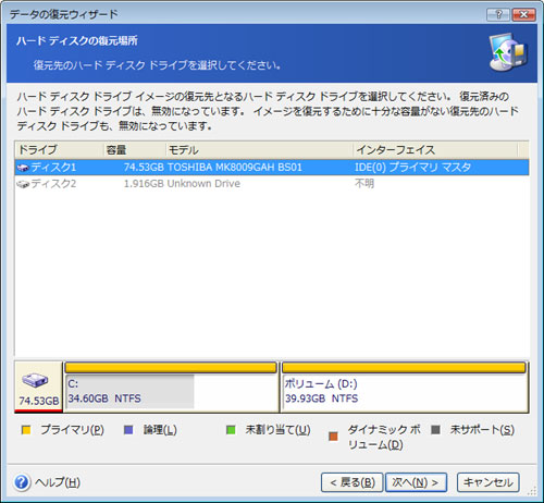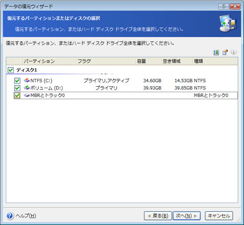 復元するパーティションまたはディスクを選択します。ここでは、ディスク全体を復元するので「ディスク1」にチェックをつけて「次へ」をクリックします。