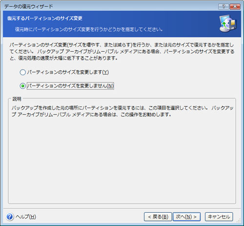 パーティションサイズを変更するかどうかをここで設定します。ここでは、「パーティションのサイズを変更しません」を選択して「次へ」進みます。