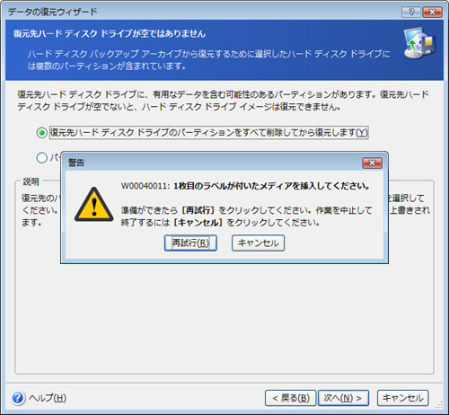 「1枚目のラベルが付いたメディアを挿入してください」というダイアログが現れたら空のDVD-Rを挿入し、「再試行」をクリックします。