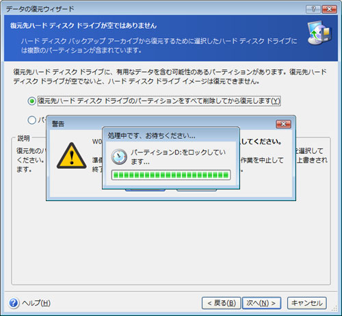 データを完全に消去しても問題ない場合に、「復元先ハードディスクドライブのパーティションをすべて削除してから復元します」にチェックをいれて「次へ」をクリックします。