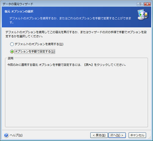 復元オプションの設定画面です。デフォルトのオプションを使うか、手動でオプションを設定するかを選びます。