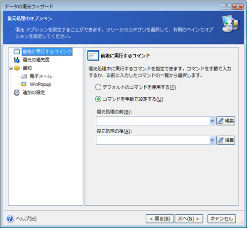 復元処理の前後に実行したいコマンドがあればここで指定します。