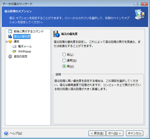 「復元の優先度」を指定します。「低」「通常」「高」の3段階。「低」にすれば低速化、「高」にすれば高速化することができます。