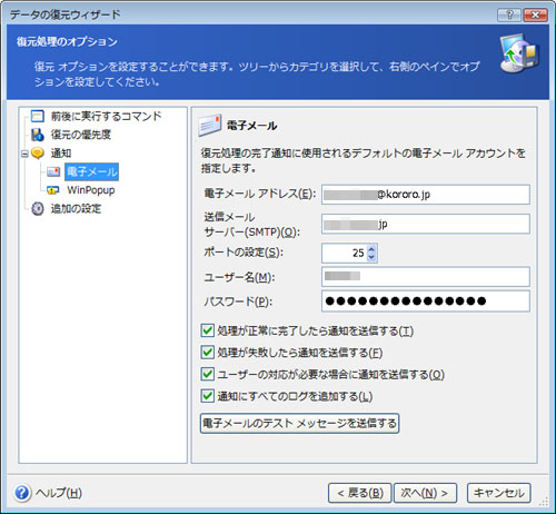 復元の完了通知をメールで受け取りたい場合にここで設定を行います。