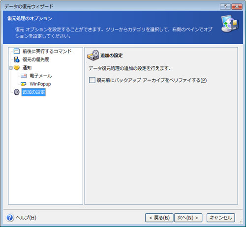 復元前に、バックアップアーカイブの検証をしたい場合は、「復元前にバックアップアーカイブをベリファイする」にチェックを入れます。