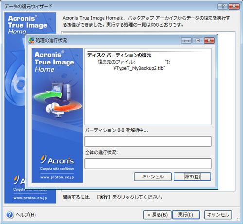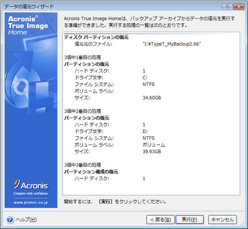 以下図の画面になったら、復元の設定を一通り確認後、「実行」をクリックします。