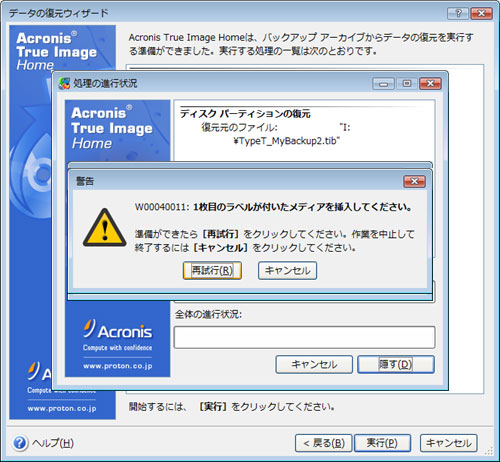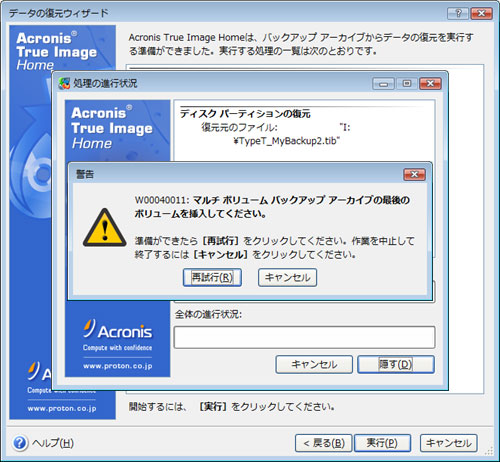 しばらくすると「マルチボリュームバックアップアーカイブの最後のボリュームを挿入してください」というダイアログが現れます。実はこれ、すでに最後のDVD-Rが入っている状態なのにも関わらず、このダイアログが現れる。しかたがないので、一旦、DVD-RWをイジェクトしてから再び同じディスクを入れなおす。これはおそらく、True