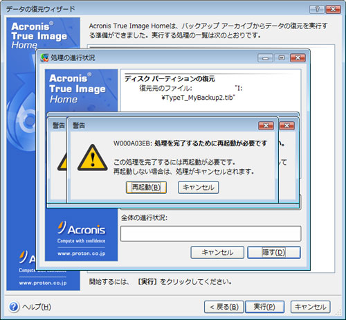 最後に再起動して、復元完了です。以上で、バックアップイメージからの復元についての説明は終了です。正常に復元できたときはかなり感動ものですよ(^^)(←正常に復元してもらわなければ困りますが…笑)。
