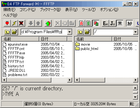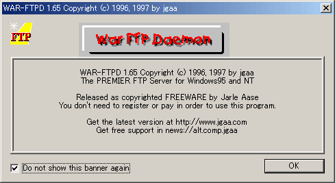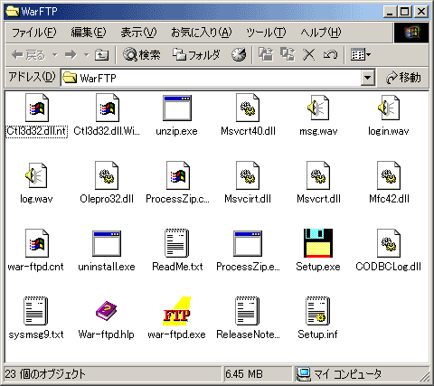 War FTP Version1.65 はただ単に解凍するだけで、インストールの必要はありません。「ward165.exe」を実行してください。以下のようにファイルが出てくれば完了です。次項の「War