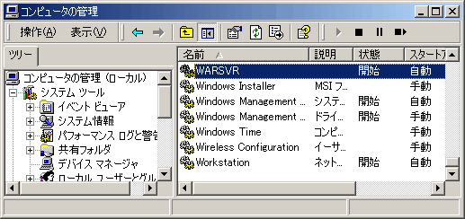 最後に、Windowsサービスとして、WarFTPD が追加登録されたかどうか確認しておきましょう。「マイコンピュータ」を右クリックして、「管理」→「サービスとアプリケーション」→「サービス」からWARSVR が追加されていることを確認しましょう。