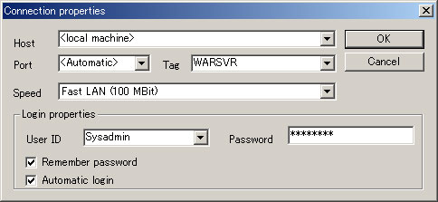 ここまで、終了すると以下のようなダイアログボックスが現れます。まず、「Speed」のところを「Fast LAN(100Mbit)」に変更します。次に、「Password」の欄に先ほどインストールの際に入力した管理者パスワード(Sysadmin)を入力します。最後に、「Remember password」にチェックを入れて、パスワードを保存させます。その他の、Host やら Port、Tag などは、デフォルトで入力されているもので問題ないです。ここまで終えたら、「OK」ボタンをクリックします。