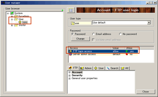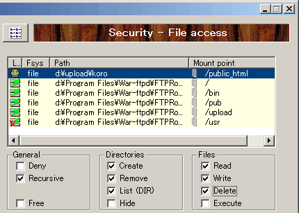 access」とクリックしてください。すると、上側の部分に、アクセス権を設定する画面が現れます。WarFTPD をインストールした時点では、デフォルトで