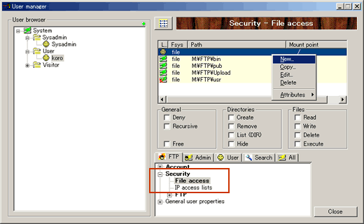 次に、koro ユーザ専用のアップロードディレクトリを作成していきます。まず、右側下のペインで「FTP」タブ→「Security」→「File
