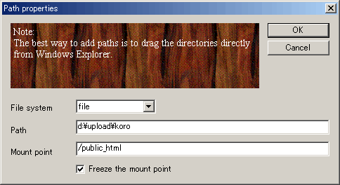 以下のような画面が現れたら、File System は「file」のまま、Pathに koroユーザ専用のアップロード先ディレクトリを指定します。この時、d:\upload\koro