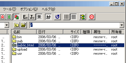 File System root (ここでは、D:\Program Files\War-ftpd\FTPRoot)に飛ばされ、public_html