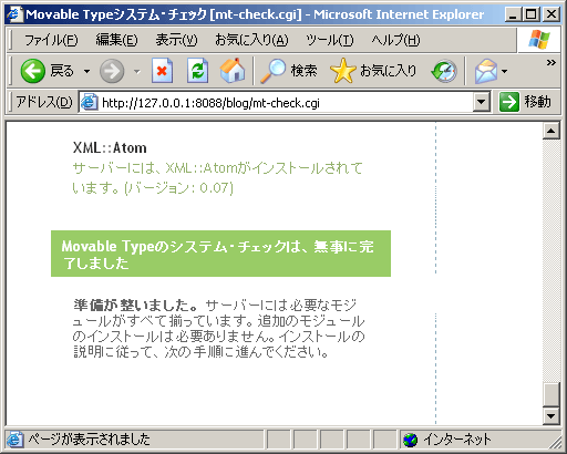 http://127.0.0.1/blog/mt-check.cgi にアクセスして、Movable Type を動作させるのに必要なものが全て揃っているかどうか確認してください。最低限、以下のように表示されていれば Movable Type は動作します。特に、最下行の「準備が整いました。 サーバーには必要なモジュールがすべて揃っています。」と表示されているか確認しましょう。