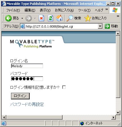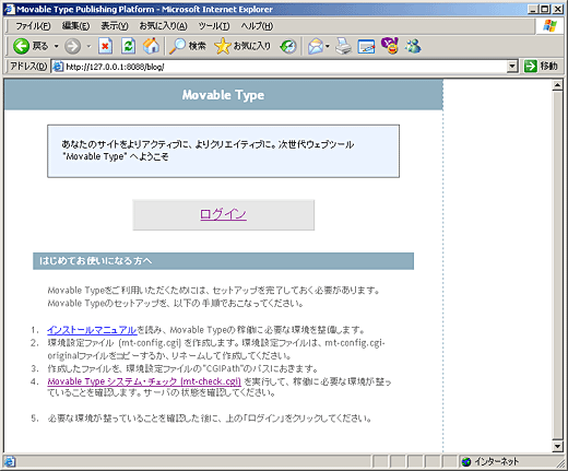 ここまで来たら、最後は、ブラウザからMTディレクトリにアクセスしましょう。ここでは、http://127.0.0.1/blog/ にアクセスします(説明の都合上、8088番ポートを使っているのは気にしないでください)。アクセスできたら、「ログイン」をクリックします。