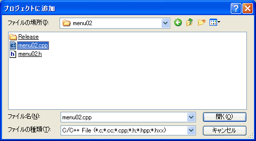 「プロジェクトに追加」ダイアログボックスで「menu02.cpp」を選択して「開く」ボタンを押します。(menu02.hは選択する必要はありません。また、menu02.rcは「ファイルの種類」の中に*.rcが無いので選択しません。)