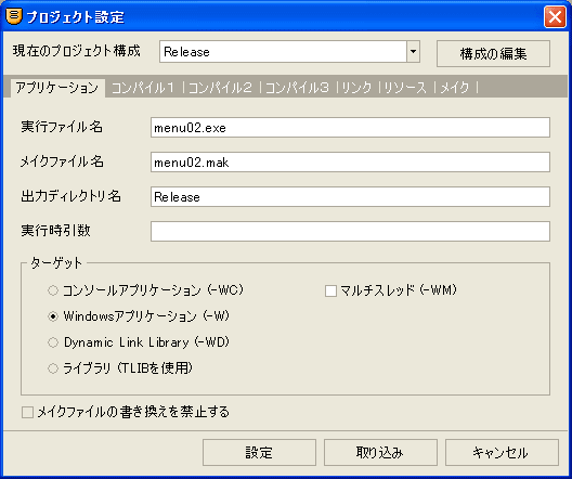 「ターゲット」を「Windowsアプリケーション(-W)」にします。