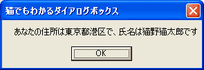 MessageBox(hDlg, szBuf, "猫でもわかるダイアログボックス", MB_OK);