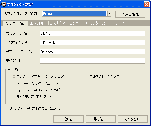 プロジェクトの設定では、ターゲットを「Dynamic Link Library(-WD)」とします。