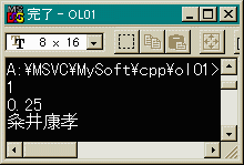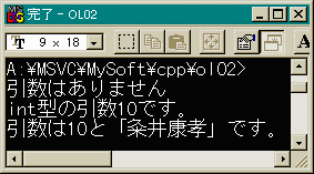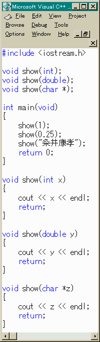 今度は、自作関数をmain関数より先に書きました。 こうすると、プロトタイプ宣言の手間が省けます。 また、coutを使わずprintf関数を使用してみました。 もちろん上のプログラムをCで処理することはできません。 (Cには関数のオーバーロードは認められていない。)#include <stdio.h> void print() { printf("引数はありません\n"); return; } void print(int x) { printf("int型の引数%dです。\n", x); return; } void print(int a, char *b) { printf("引数は%dと「%s」です。\n", a, b); return ; } int main(void) { int a = 10; char *str = "粂井康孝"; print(); print(a); print(a, str); return 0; }