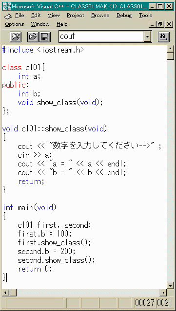 のように記述されることが多い。::はスコープ解決演算子 と呼ばれるものでclass test { int a; char str[32]; public: int b; void show_class(int c); } void test :: show_class(int c) { ..... }