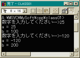 main関数内でcl01 first, second;などとあたかもcl01という データ型の変数を宣言しているようですね。 これも構造体の時と似ていますね。 構造体について忘れてしまったときは、 C言語編第15章を 参照してください。