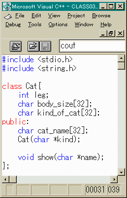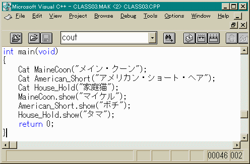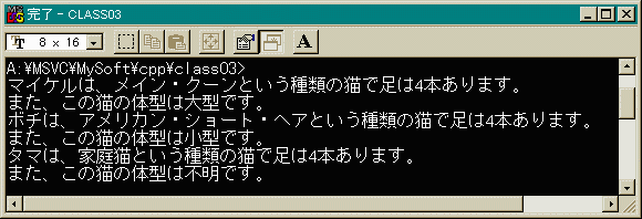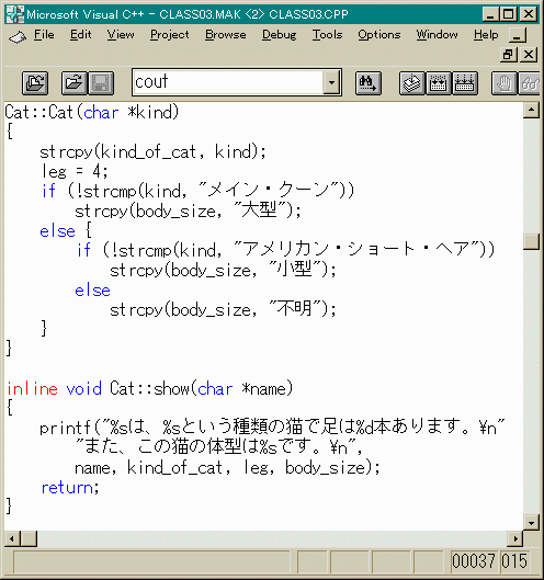 また、メンバ関数showも猫の名前(それぞれの個の名前。 「タマ」とか「クロ」とか)を引数として 取ることにしました。