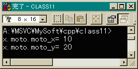 #include <iostream.h> class Moto { public: int moto_x; int moto_y; Moto(); }; class Composition { public: Moto moto; //メンバオブジェクトです }; Moto::Moto() { moto_x = 10; moto_y = 20; } int main(void) { Composition x; cout << "x.moto.moto_x= " << x.moto.moto_x << endl; cout << "x.moto.moto_y= " << x.moto.moto_y << endl; return 0; }