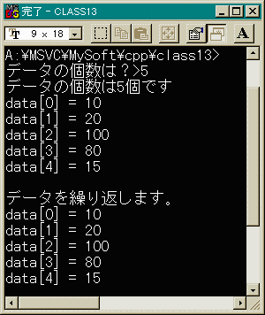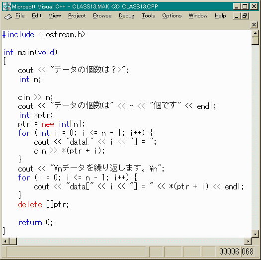 のように使います。2番目の使い方は「データ型」で示した 領域を「個数」分だけ確保します。失敗したときは0を返します。 成功した場合は、確保した領域の先頭のアドレスを返します。 使い終わったら、delete演算子で解放します。 では、具体例を見てみましょう。new データ型 new データ型[個数]