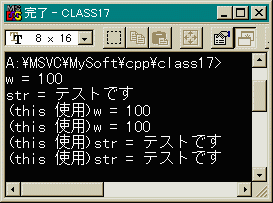 このプログラムの実行結果は次のようになります。 thisポインタの使い方をよく見て下さい。 特別難しいことはないでしょう。#include <iostream.h> #include <string.h> class A { int w; char str[32]; public: A(); void test(); }; A::A(void) { w = 100; strcpy(str, "テストです"); } void A::test(void) { cout << "w = " << w << endl; cout << "str = " << str << endl; cout << "(this 使用)w = " << this->w << endl; cout << "(this 使用)w = " << (*this).w << endl; cout << "(this 使用)str = " << this->str << endl; cout << "(this 使用)str = " << (*this).str << endl; return; } int main(void) { A renshu; renshu.test(); return 0; }