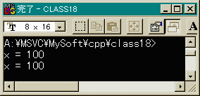 上の例題の意味が分かったでしょうか。クラスA のメンバ関数show()の戻り値の型は、Aとなっています。 従ってこの関数の戻り値をクラスAのオブジェクトに 代入することができます。上のプログラムの実行結果は 下に示すようになります。#include <iostream.h> class A { int x; public: A(); A show(); }; A::A(void) { x = 100; } A A::show(void) { cout << "x = " << this->x << endl; return *this; } int main(void) { A test1, test2; test2 = test1.show(); test2.show(); return 0; }