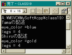 上の例では、関数showは、メンバ関数ではありません。 しかし、CatClassの中でfriend宣言をしているため プライベートメンバにアクセス可能です。#include <iostream.h> #include <string.h> class CatClass { int legs; char eye_color[32]; public: CatClass(); CatClass(char *str); friend void show(CatClass); }; CatClass::CatClass(void) { legs = 4; strcpy(eye_color, "gold"); } CatClass::CatClass(char *str) { strcpy(eye_color, str); legs = 4; } void show(CatClass a) { cout << "eye_color =" << a.eye_color << endl; cout << "legs = " << a.legs << endl; return; } int main(void) { CatClass Tama("blue"), Shiro; cout << "Tamaの記述" << endl; show(Tama); cout << "Shiroの記述" << endl; show(Shiro); return 0; }