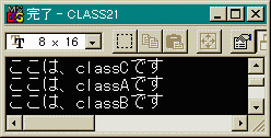 #include <iostream.h> #include <string.h> class A { protected://継承先からアクセスできるように char str[64]; public: A(); }; class B { protected://継承先からアクセスできるように char str[64]; public: B(); }; class C : public A, public B//基本クラスをコンマで区切って書く { char str[64]; public: C(); void show(void); }; A::A(void)//コンストラクタ { strcpy(str, "ここは、classAです\n"); } B::B(void)//コンストラクタ { strcpy(str, "ここは、classBです\n"); } C::C(void)//コンストラクタ { strcpy(str, "ここは、classCです\n"); } void C::show(void) { cout << str;//ただ単にstrではclass Cのstr cout << A::str;//スコープ解決演算子 cout << B::str;//スコープ解決演算子 return; } int main(void) { C test; test.show(); return 0; }