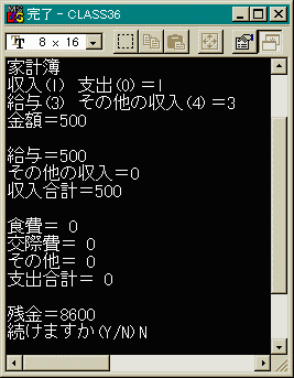void Komoku::SetSection(void) { char kind[8]; while(1) { cout << "収入(I) 支出(O)="; cin >> kind; if (kind[0] == 'I' || kind[0] =='O') break; else cout << "入力が不正です" << endl; } if (kind[0] == 'I') { cout << "給与(3) その他の収入(4)="; }else { cout << "食費(1) 交際費(2) その他(0) ="; } cin >> Komoku::Item; return; }