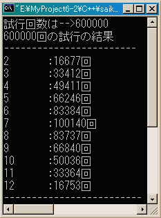 まずは、実験をするので大元になるクラスExamクラスを作りました。 このクラスは試行回数n, 結果を格納する配列y, 結果を表示するshow関数を メンバとして持っています。// saikoro.cpp #include <iostream.h> #include <string.h> #include <stdlib.h> #include <time.h> class Exam { protected: int n, y[11]; void show(); public: Exam(); }; Exam::Exam() { memset(y, 0, sizeof(y)); cout << "試行回数は-->"; cin >> n; } void Exam::show() { int i; cout << n << "回の試行の結果" << endl; cout << "------------------------" << endl; for (i = 0; i <= 10; i++) cout << i + 2 << "\t:" << y[i] << "回" << endl; cout << "-------------------------" << endl; return; }