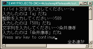 メンバ関数のshowは引数をそのまま返すだけのもっとも単純な関数です。// clsstemp.cpp #include <stdio.h> #include <string.h> template <typename T> class Test { public: T show(T); }; template <typename T> T Test <T>::show(T userinput) { return userinput; } int main() { char c, d; int i, j; char str[256], *strx; Test<char> MyChar; Test<int> MyInt; Test<char *>MyStr; printf("1バイト文字を入力してください-->"); scanf("%c", &c); d = MyChar.show(c); printf("入力したのは「%c」だね\n", d); printf("整数を入力してください-->"); scanf("%i", &i); j = MyInt.show(i); printf("入力したのは「%d」だね\n", j); printf("文字列を入力してください-->"); scanf("%s", str); strx = MyStr.show(str); printf("入力したのは「%s」だね\n", strx); return 0; }