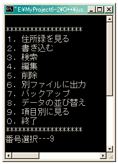 main関数です。int main() { Jusho j; int no, cont = 1; while (cont) { cout << endl; cout << "*******************" << endl; cout << "1.住所録を見る" << endl; cout << "2.書き込む" << endl; cout << "3.検索" << endl; cout << "4.編集" << endl; cout << "5.削除" << endl; cout << "6.別ファイルに出力" << endl; cout << "7.バックアップ" << endl; cout << "8.データの並び替え" << endl; cout << "9.項目別に見る" << endl; cout << "0.終了" << endl; cout << "*******************" << endl; cout << "番号選択---"; cin >> no; switch (no) { case 0: cont = 0; break; case 1: j.show("", JFILE); break; case 2: j.write(); break; case 3: j.search(); break; case 4: j.edit(); break; case 5: j.del(); break; case 6: j.fileoutput(); break; case 7: j.backup(); break; case 8: j.sort1(); break; case 9: j.itemview(); break; default: cout << "番号が違います" << endl; break; } } return 0; }