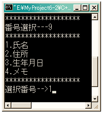 項目別に表示する関数です。一行ずつ見ていくと別にどうということはないですね。 サブメニューで選択した番号以外は、coutしていないだけです。int Jusho::itemview() { int n, i; char no[8]; ifstream J; cout << "*******************" << endl; cout << "1.氏名" << endl; cout << "2.住所" << endl; cout << "3.生年月日" << endl; cout << "4.メモ" << endl; cout << "*******************" << endl; cout << "選択番号-->"; cin >> no; if (strcmp(no, "1") != 0 && strcmp(no, "2") != 0 && strcmp(no, "3") != 0 && strcmp(no, "4") != 0) { cout << endl; cout << "番号入力エラーです" << endl; return -1; } J.open(JFILE, (ios::nocreate)); if (J.is_open()) J >> n; else { cout << "住所録データはありません" << endl; return -1; } for (i = 0; i < n; i++) { J >> data.name; if (strcmp(no, "1") == 0) { cout << i + 1 << ":"; cout << data.name << endl; } J >> data.address; if (strcmp(no, "2") == 0) { cout << i + 1 << ":"; cout << data.address << endl; } J >> data.birth_year; J >> data.birth_month; J >> data.birth_day; if (strcmp(no, "3") == 0) { cout << i + 1 << ":"; cout << data.birth_year << "年" << data.birth_month << "月" << data.birth_day << "日" << endl; } J >> data.memo; if (strcmp(no, "4") == 0) { cout << i + 1 << ":"; cout << data.memo << endl; } } J.close(); cout << "Hit any key!" << endl; getch(); return 0; }