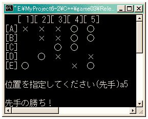 碁盤のマス目をMASUで定義しています。この値を変えることにより いろいろなマス目の碁盤を作ることができます。// game03.cpp #define MASU 5 #include <windows.h> //GetStdHandle関数などを使うので必要 #include <iostream.h> #include <stdio.h> class Ban { int ban[MASU][MASU], nTe; //ban[x][y]石の位置種類 nTe:何手目か HANDLE hOut; BOOL bSente; //TRUE:先手 FALSE:後手 char szHantei[32]; int Locate(int, int); int checkLocation(int, int); int bandraw(); int judge(); public: Ban(); int putStone(); };