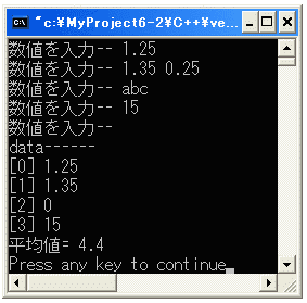などというように使うと警告がでます。この場合v.size()をint型にキャストしてしまえばワーニングが出なくなります。では、簡単なプログラムを作ってみましょう。適当な数値を入力していき平均値を出すというものです。入力が終了したら、「数値を入力--」のところで何も入力せずにリターンキーを押します。また、数値入力時に数値以外のものを入力すると0.0と見なされます。 また、入力時にスペースを入れると、スペース以降は無視されます。「0.5 32 158」と入力すると0.5とみなされます。