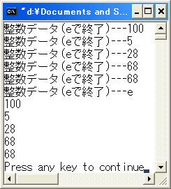 整数値をどんどん入力していきます。 これをpushメンバ関数で追加していきます。 データを入れ終わったら、eと入力します。 すると、入力順に数値が表示されます。 これには、frontメンバ関数で、先頭要素を取得し、表示し終わったら 先頭要素を削除します。